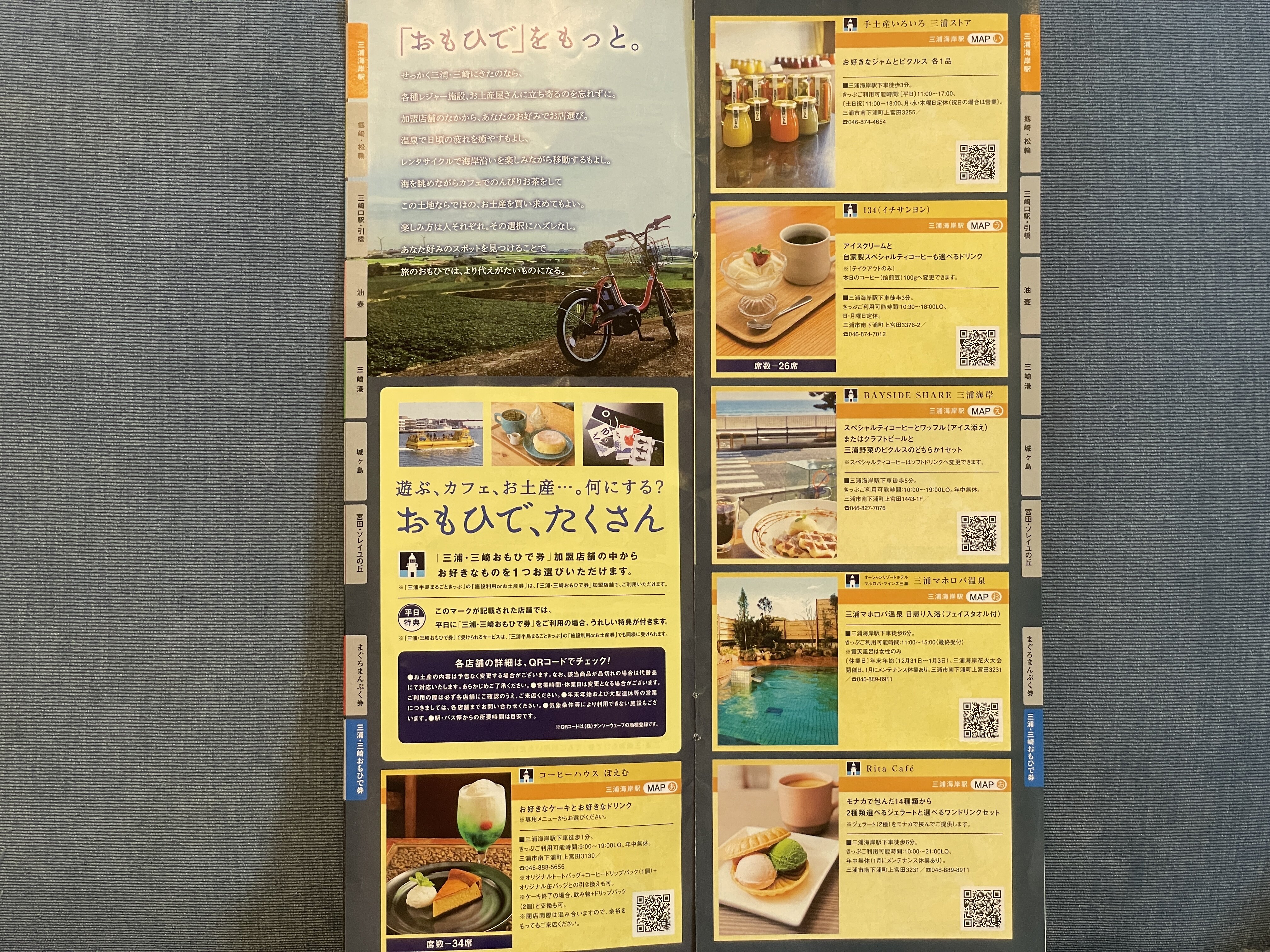 「三浦・三崎おもひで券」を使える施設は21か所。こちらはもっと多岐にわたっており、お土産、スイーツからレンタサイクル、オープントップバスに日帰り温泉まであります。さらに、もう少し課金をするとSUPの体験やクロスバイクレンタルなどもあり、思わず目移りしてしまいますが…。