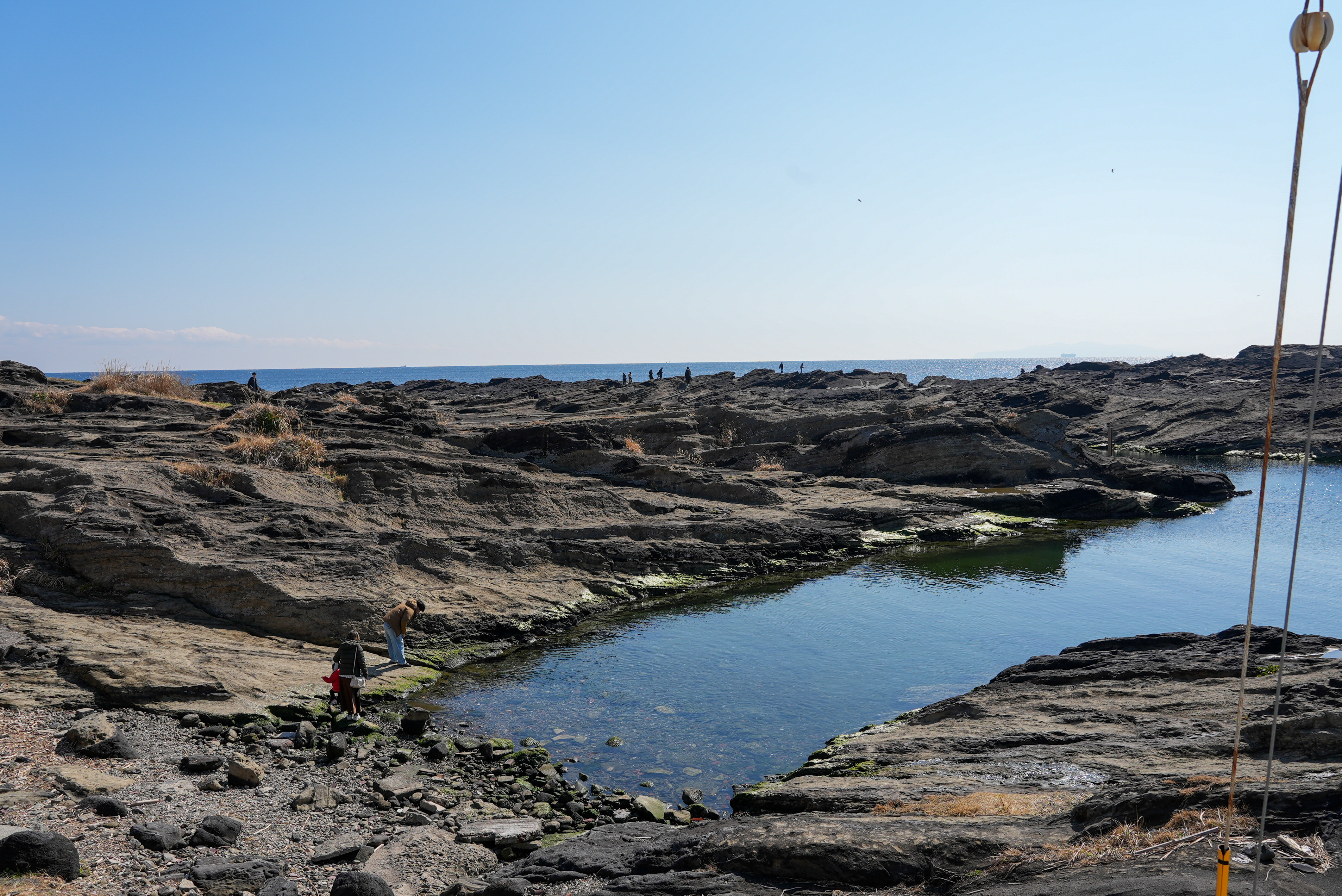 その道を進んでいくと、岩畳広がる磯が見えてきました。長津呂の磯と呼ばれる場所で、このダイナミックな景色をみているだけでも、もちろん楽しいのですが…
