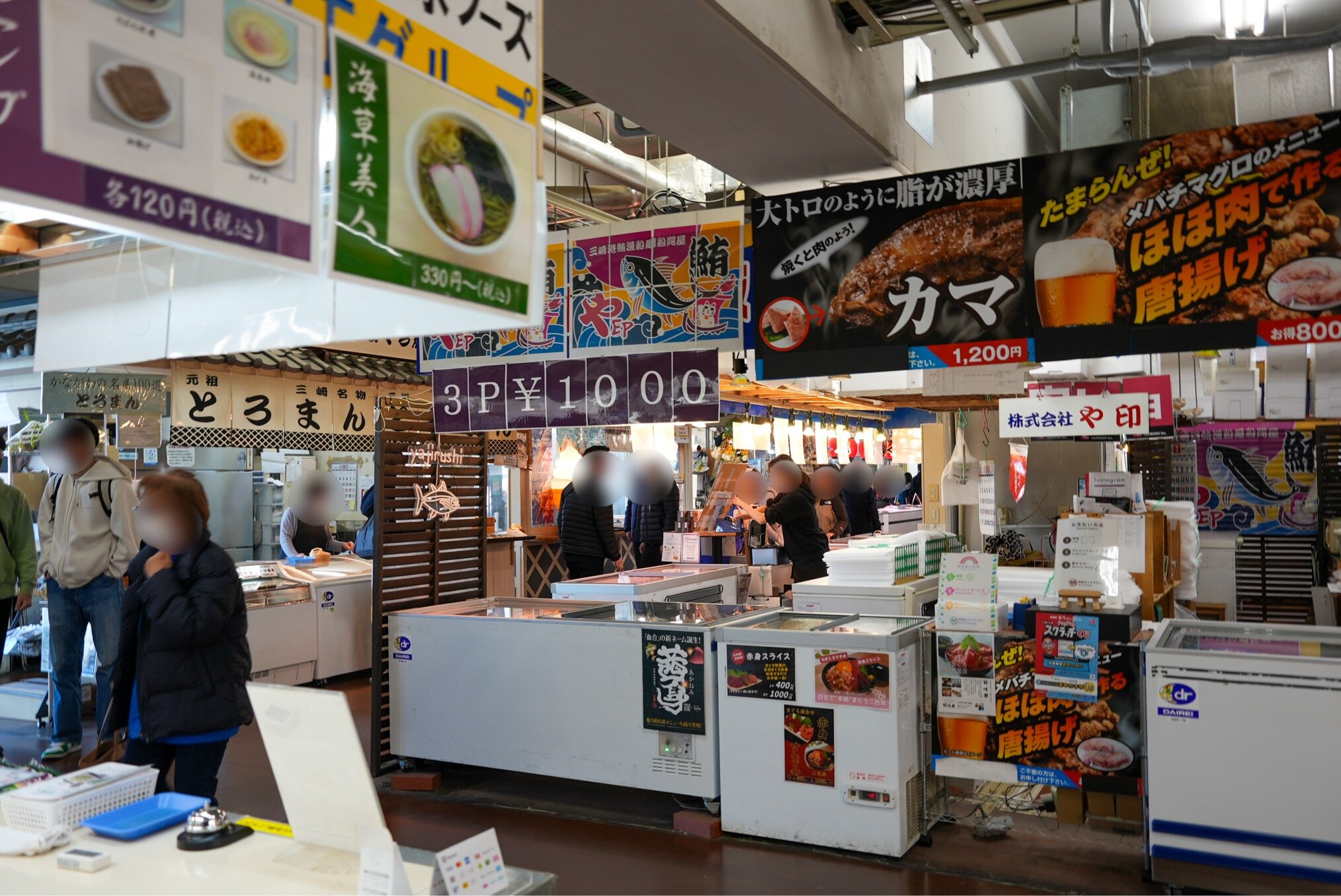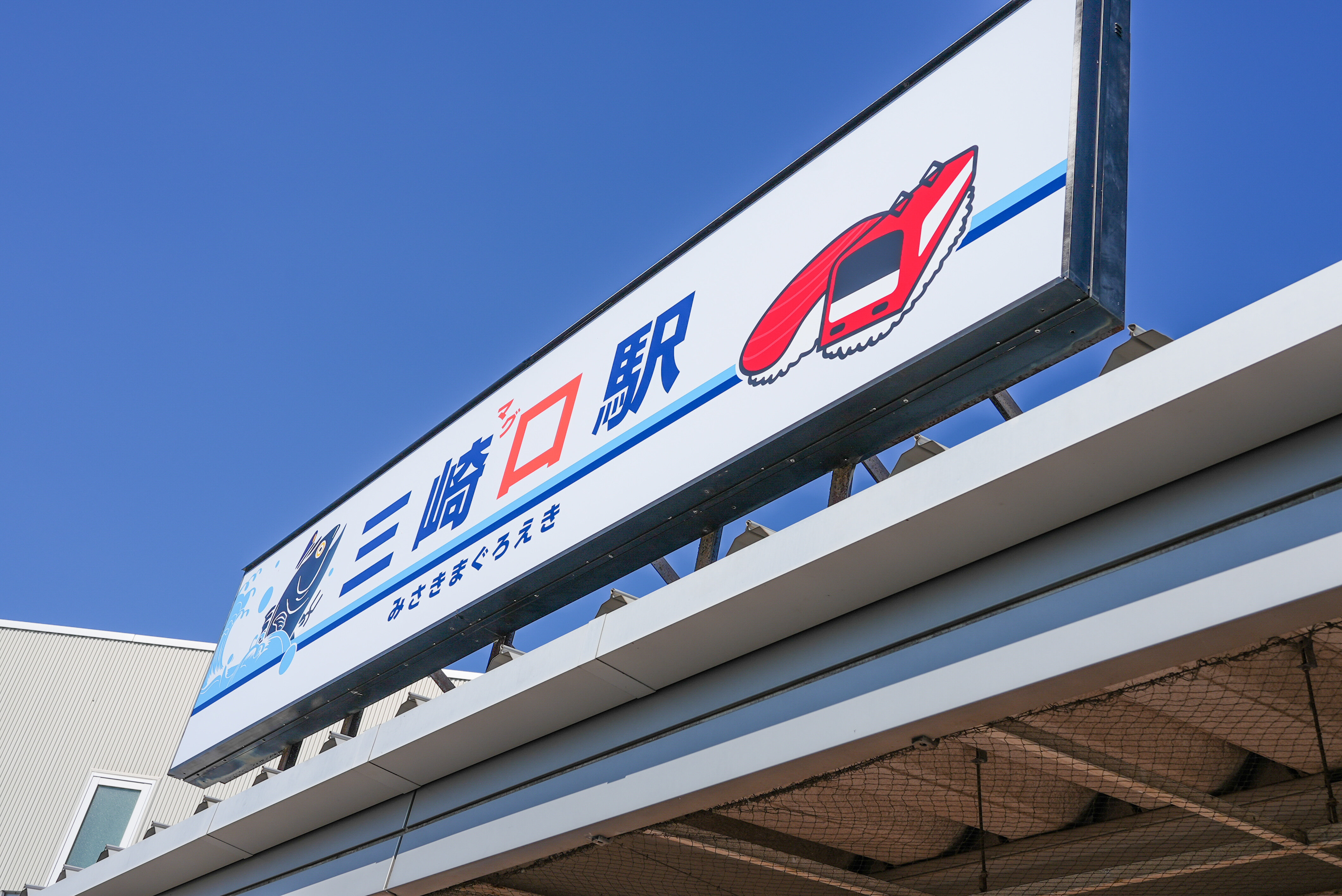 札をでるとすぐに、海産物を売っている売店もありました。ちなみに駅看板には「三崎“マグ”ロ駅」なんて文字も。こんな遊び心も素敵です。