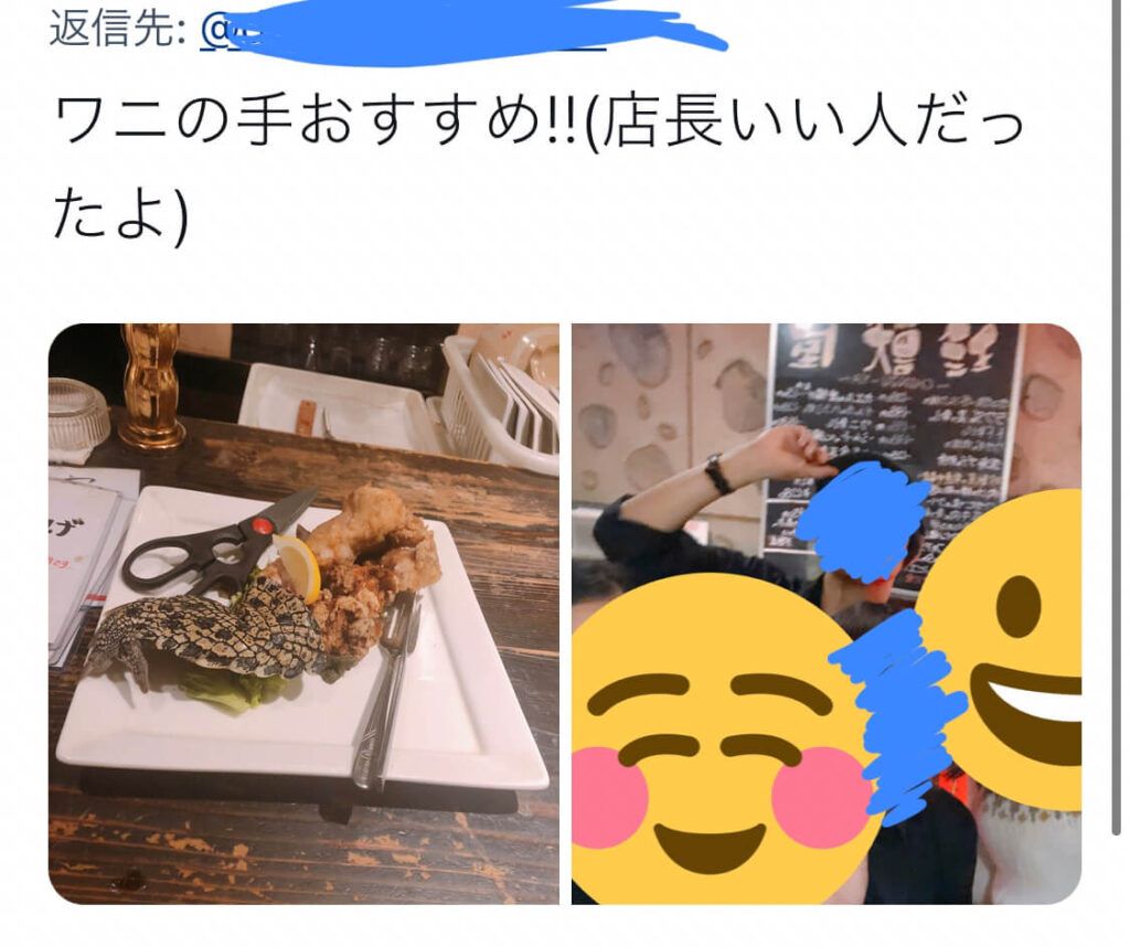 しかしなんでも食いそうな友人1は既に足を運んでおりワニを楽しんでましたし何故か店長さんとノリノリで一緒に写真を撮ってました(友達?)
