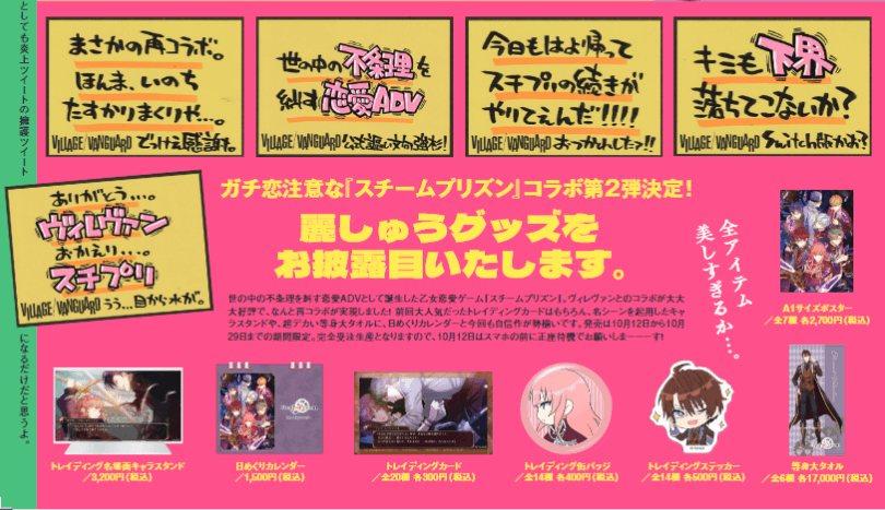 世の中の不条理を糾す恋愛ADVとして誕生した乙女恋愛ゲーム「スチームプリズン」のヴィレヴァンコラボグッズが大大大好評でなんと再コラボが実現しました!イェーイ✌
